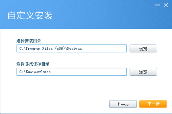 2、你有两种方式安装,可以直接点击界面的一键安装选项,软件就会默认安装到系统C盘中。或者点击自定义安装,出现下图界面,选择合适的安装目录和游戏保存目录后,再点击界面下方的下一步。(小编建议用户选择自定义安装,将软件安装到其他盘中。因为C盘为系统盘,软件过多会导致电脑系统运行慢。)