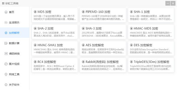 彩虹工具箱官方版提供MD5加密、PIPEMD-160加密、AES加密解密等小工具