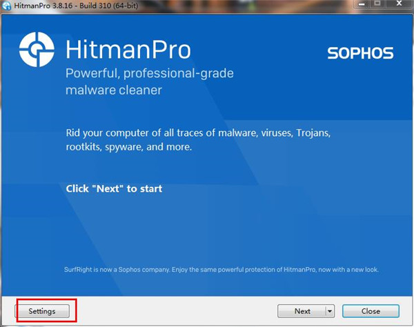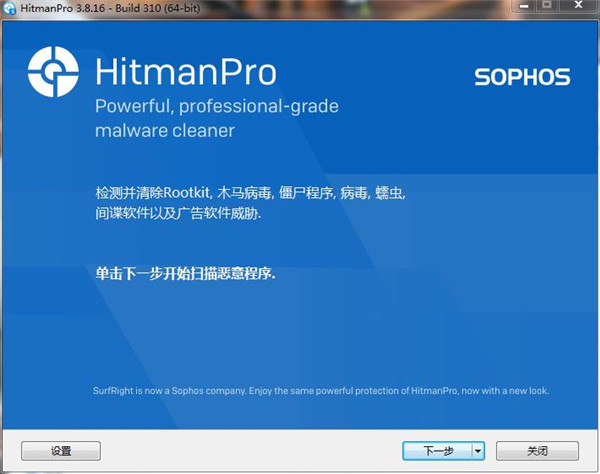 3、设置成Hitman Pro中文界面了,可以无限制使用,点击下一步即可扫描病毒。