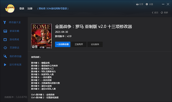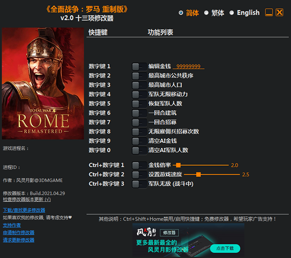 罗马全面战争重制版修改器风灵月影版可不是其游戏资源哦,它是该游戏的多功能修改器,它是只有当大家下载好了罗马全面战争重制版这款游戏之后才能够进行使用的,其中的修改功能十分的强大,不仅可以给大家带来无限金钱、无限士兵等资源的修改功能,它还能为大家提升游戏速度、增加各种任务的完成次数,所以说如果大家想要体验到更加棒的游戏感受,那么下载它绝对是你无需多想的决定!而且该修改器的使用方法十分简单,如果大家不会的话,那么大家可以去到咱们软件介绍的下方详细了解一下,小编已经帮大家将其一一列举在下方了,有需要的朋友们可以前来下一下、使用看看!最后小编还想向大家强烈安利一下这款游戏,这款游戏可以说是今夏最引人瞩目的一款大型即时战略类游戏了,想试玩一下它的小伙伴们还请速速到本站来进行下载哟!而且搭配上这个罗马全面战争修改器体验效果会更佳呢!