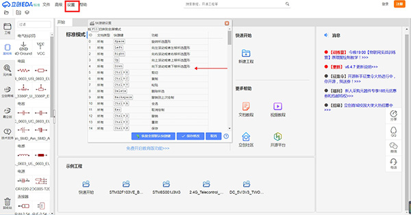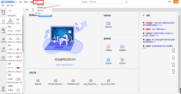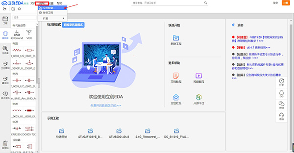 编辑器左侧的导航面板是立创EDA非常重要的一个组成模块,你可以在这里找到你的工程,系统基础库,设计管理器,元件库,他人共享给你的文件等