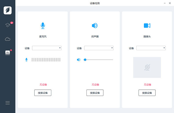 在主界面点选“设备检测”栏,可以对麦克风、扬声器、摄像头等硬件进行正常异常检测