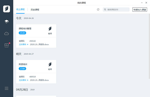 在主界面点选“我的课程”栏,主界面会显示所有“待上课程”,也可以通过界面上的“快速进入课堂”输入短码方式进行课堂