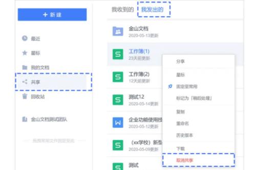 5、 点击左侧「共享」,并进入「我发出的」, 右键需要取消共享的文件夹,确认后将取消共享,仅你自己可访问