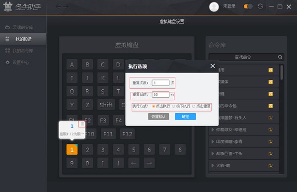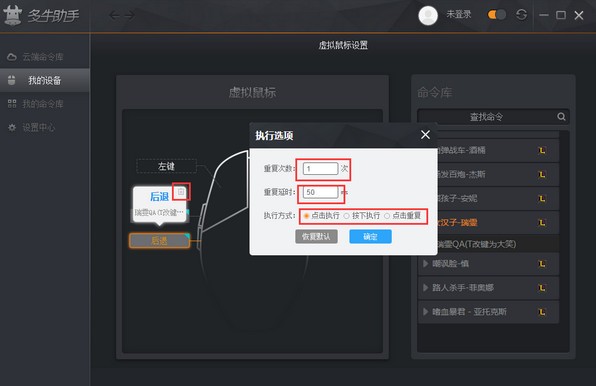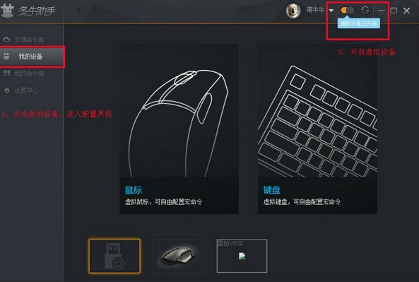 3、直接从命令库配置相对繁琐,可直接点击“我的设备”,进入配置,同时开启虚拟设备。点击“鼠标”或“键盘”进入自定义按键设置