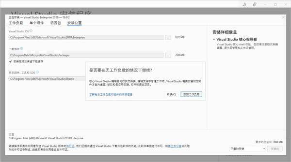 8、出现一个系统提示,点击“继续”或“添加工作负载”都可