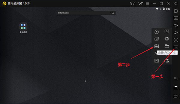 点击模拟器右侧的更多功能,点击安装apk或者ctrl+3,打开apk安装位置即可。