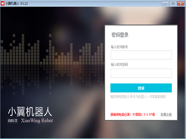 1、双击打开机器人程序,提示输入软件账号密码,第一次使用,请先点击右下角【免费注册】