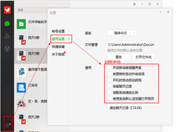 4、第一次登录pc微信,切记点左下角设置,关闭自动更新和开机自动启动