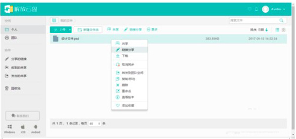 2、右击文件,选择共享或链接分享。共享可以与同企业内的云盘用户快速分享该文件;链接分享可以为文件生成链接,并配置权限,与任何人分享。将设计文件发送给客户或印刷厂时,可以选择链接分享。