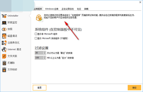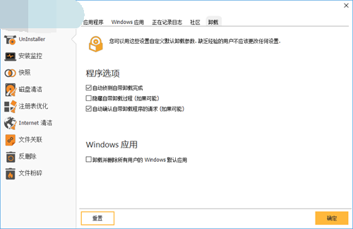 4、提示设置功能,您可以使用这些设置自定义默认卸载参数,没有经验的朋友最好不要更改任何设置