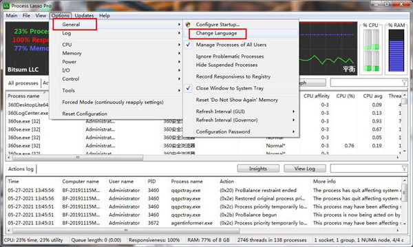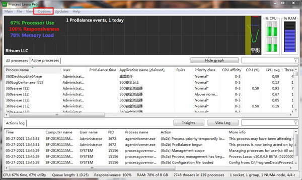5、重启Process Lasso软件之后,就可以看到软件界面是中文的了,可以无限制使用。
