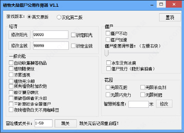 植物大战僵尸修改器中文电脑版,该软件就是专门用来玩这个游戏的修改器,大家都喜欢将它们称作是作弊器,这个专门为植物大战僵尸而开发的一款小巧的游戏辅助工具,使用这个软件之后玩家们能够通过它任意的修改游戏内的阳关金钱,同时还能够控制僵尸的移动速度,你可以一边玩一遍设置,让你玩家们轻松玩透这个游戏,不仅如此,还能够设置无线金钱,之舞能够随便放,浓雾透视,之舞冷却,化肥无限使用等各种属性的修改,十分强大,可以有效地帮助玩家降低游戏的难度,此外这个修改器十分的小巧,只需要将文件下载解压后双击就可以使用了,无需安装,支持植物大战僵尸的多个版本,大家在使用植物大战僵尸修改器的时候注意版本号哦!