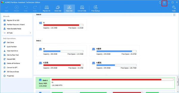 7、打开傲梅分区助手软件,软件是英文界面,点击右上角菜单按钮,选择settings。
