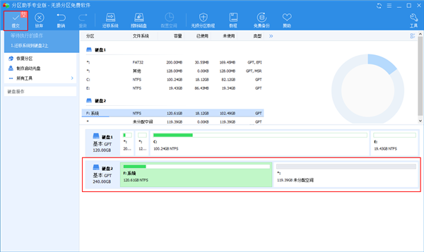 5、来到分区助手主界面:您可以看到“等待执行的操作”一栏,您可以更改、保存您的操作。点击主界面左上角“提交”,并根据分区助手的提示信息,完成您的SSD 系统迁移。
