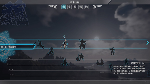 首先从魏国的曹操、吴国的孙坚和蜀国的刘备之中选择要体验的武将。随着游戏的进行,也可以选择其他势力和武将。每个势力都有故事,开始的章节、迎来结局的章节都因武将而异。游戏有所进展后可以游玩的武将会增加。选择标题选单的“选择故事”后,可以选择武将。游戏中预做保存的话,还可以于变更武将后返回原来的武将继续游戏。如要继续游戏,于“选择故事”选择武将后,选择“继续游玩”