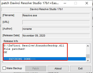 2、以管理员身份运行【davinci.resolve.studio.17b1-patch+EasyDCP.exe】,取消勾选【Make Backup】,点击patch