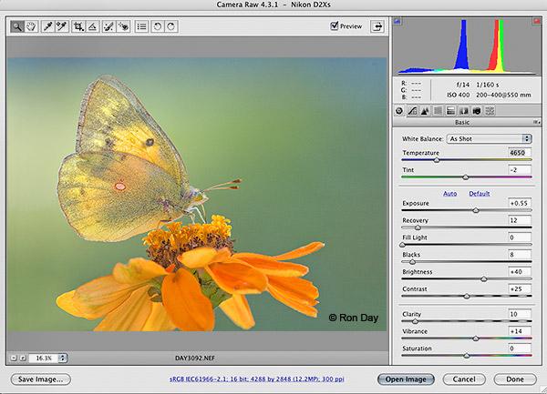 用Adobe Camera Raw最新版打开文件,云雾满盈的山巅是这幅照片的主体,所以我们首先对此进行调整,稍后再处理天空。将曝光设置为+0.30,提高画面整体亮度,然后将填充亮光设置为+19,显示远山的更多细节