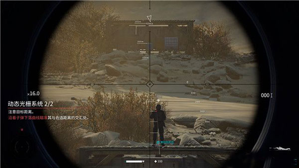 由于此时你已经获得了敌人与你之间的距离。这次你可以根据距离长短,拉近或拉远狙击枪的镜头,使其在合理的数值范围内