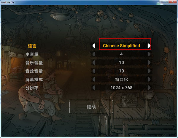 3、进入游戏之后,开始为英文界面,我们需要选择简体中文,如图所示,同时您还可以在这里调节音量、音效、屏幕分辨率、屏幕模式等,然后点击继续