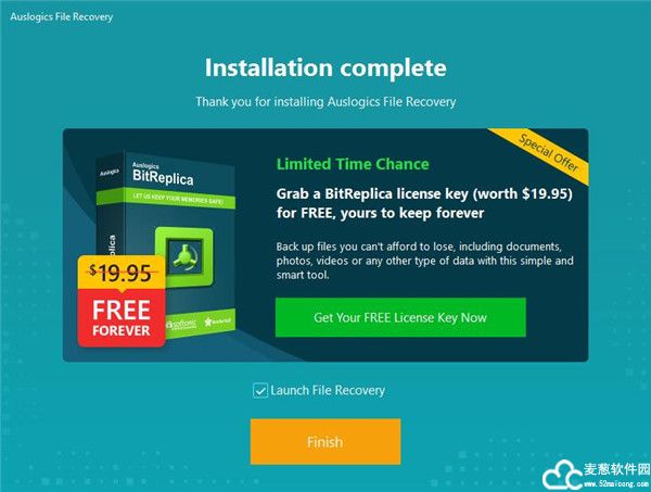 4、Auslogics File Recovery安装完成,取消勾选点击finish退出引导;