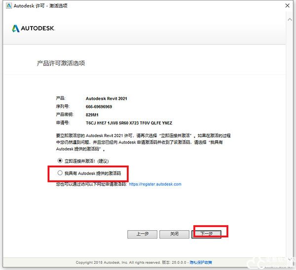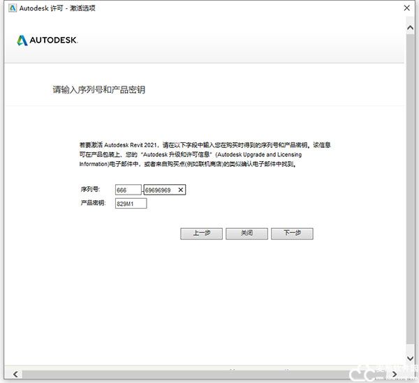12、输入revit2020序列号【666-69696969】和密钥【829M1】,点击下一步继续
