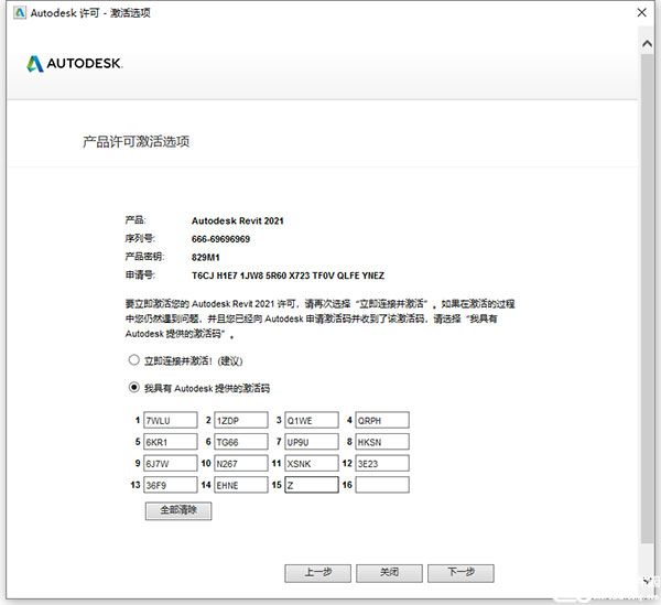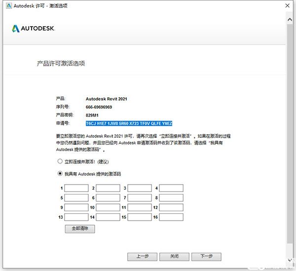 14、重新在桌面上打开Revit 2021,点击激活,输入上方的序列号,点击我具有Autodesk提供的激活码