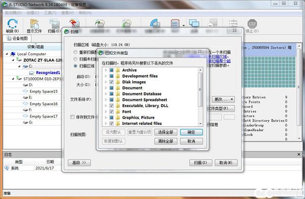 3、然后R-Studio界面上就会出现一个已知文件类型对话框,我们在对话框中点击“清除全部”按钮,再根据自己的需要勾选需要恢复文件的类型,比如小编勾选“图形、图片”。