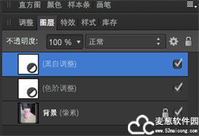 通过黑白处理后,右边的图层出现了三个??对话框,把色阶和黑白去处后,就是原来的图片,这就是无损处理。