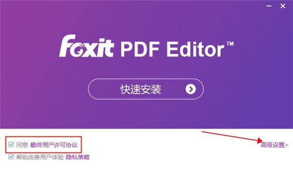 1、下载并解压,运行EXE程序安装,选择同意许可协议条款,点击高级设置。