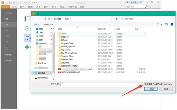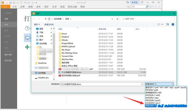2、在格式范围里选择“所有文件”,然后就会出现包括Word文档在内的所有文件,点选需要转换成PDF的Word文档,之后点击“打开”;