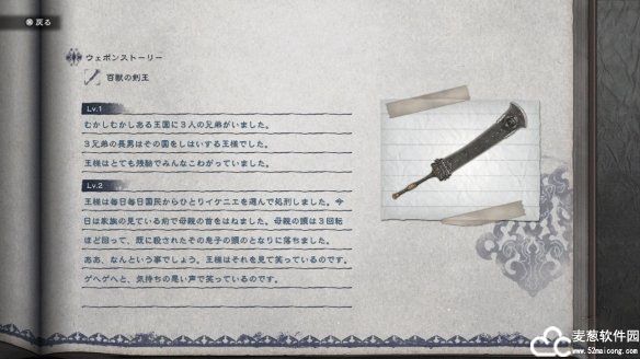主角能使用的武器包含单手剑、双手剑和长枪三种,各种武器可以在战斗中切换。另外,武器可以在在特定商店强化。各武器的“武器故事”会随着强化而陆续解锁