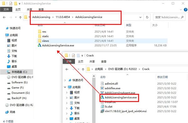 7、接着打开下载的crack破解文件夹,将里面的“AdskLicensingService.exe”文件复制到以下路径并进行替换,如下图