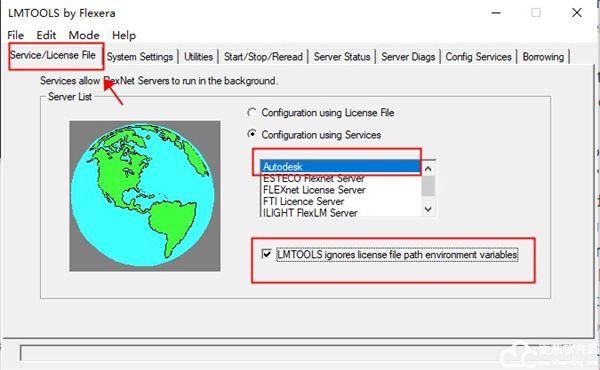 13、在“service/license file”中选择刚才的 Autodesk服务,然后勾选下面的ignore license file path env var