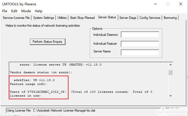 15、最后在“server status”点击“perform status enquiry”,看到有adskflex: UP v11.18.0就表示破解成功了,没有则找到问题重试