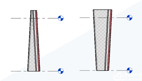 创建具有可变宽度层的墙类型,以启用锥形面。在“墙类型”属性中定义锥角。根据需要,使用单个墙的实例属性替代它们。正角度将使面的顶边朝向墙中心倾斜。负角度将使面的顶边背离墙中心倾斜。定义测量墙总宽度的位置:墙的顶部、底部或基础