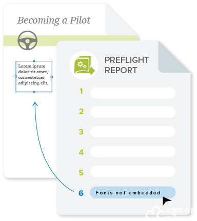 印前检查报告包含可单击的警告和错误列表,这些警告和错误以可视方式准确指示 问题所在的位置。