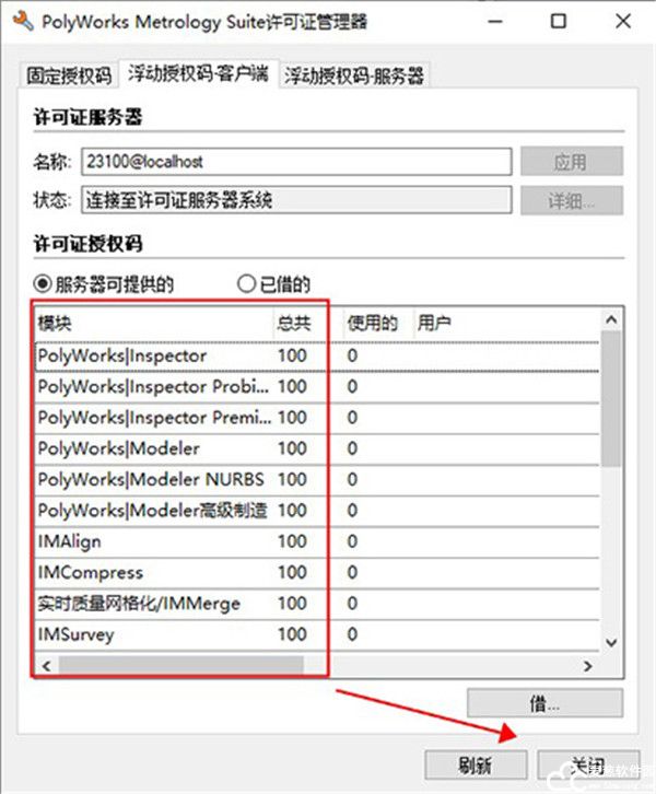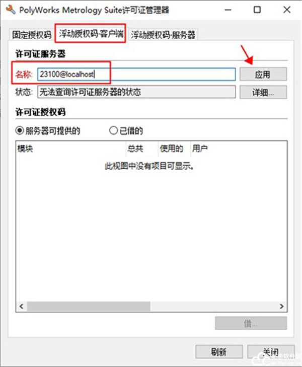 3、再次打开软件,会弹出许可证管理器,在浮动授权码-客户端输入名称:23100@localhost,点击应用