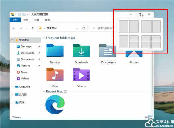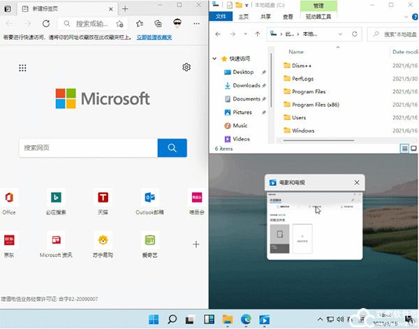 5、以往的多窗口任务模式,要么将窗口拖离屏幕一侧,触发多任务模式,要么使用快捷键开启多任务模式。现在,多任务模式又新增加了两种打开方式,一种是直接点击任务栏中的多任务图标,另一种则是将鼠标放在视窗的最大化按钮上。这样设计的好处在于方便用户操作,并且多任务模式的开启方式也会看起来更加直观。值得一提的是,文件资源管理器中的图片、音乐、视频等文件夹图标进行了重新设计,采用了更加扁平化的多彩设计,并加入了对应文件类型的图案