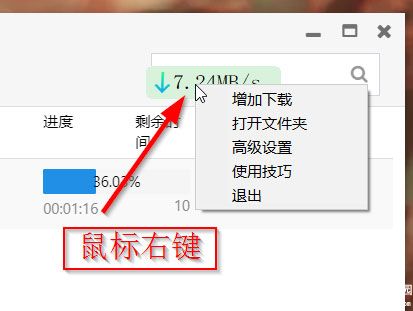 在Qdown里面如果需要添加迅雷下载链接,请在下载速度悬浮控件上右键,弹出菜单中选择”增加下载”