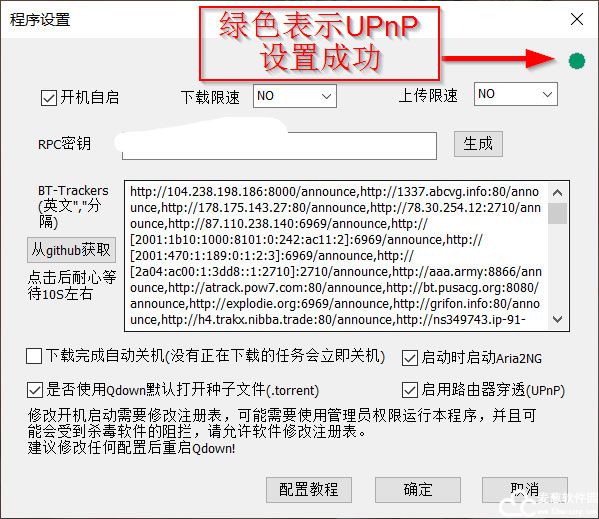 4、BT-Trackers设置,不会和不懂的小伙伴直接点击从github获取按钮一次即可自动配置(建议经常点击该按钮哦,保证BT下载速度的秘诀)