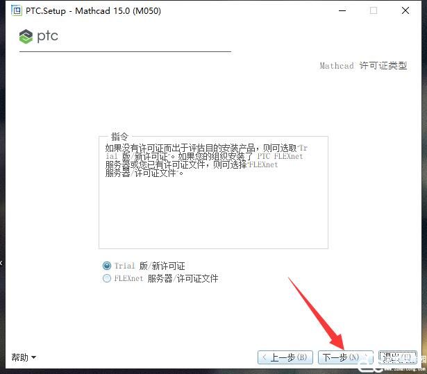 5、选择许可证类型:如果没有许可证而出于评估目的安装产品,则可选取“Trial 版/新许可证”;如果您的组织安装了 PTC FLEXnet 服务器或您已有许可证文件,则可选择“FLEXnet 服务器/许可证文件”;
