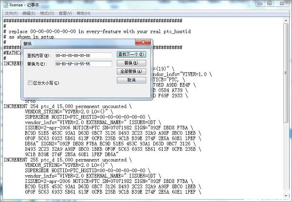 12、打开软件包中“破解补丁”文件夹,找到license.DAT文件,用记事本打开即可,将其中显示为00-00-00-00-00-00的文字全部用记录下的PTC主机id替换后保存即可。注意:全部替换哦,否则破解会失败