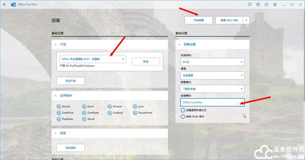 5、在安装office之前一定要卸载之前的旧版本,在产品选项中选择office专业增强版2021,选择64位,还需要选择office tool plus安装模块,点击右上角的开始部署;