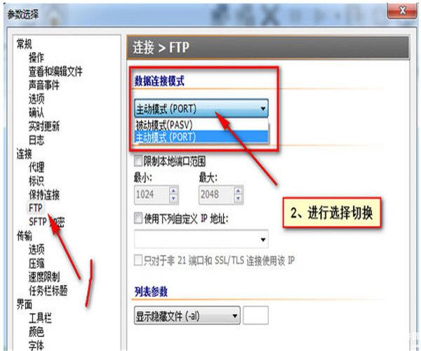 2、然后在参数选择窗口,我们点击左边的“>>连接>>FTP”找到下面的 数据连接模式选择,一种是主动一种是被动,默认是补动连接,如果慢我们可以换成主动连接看看。