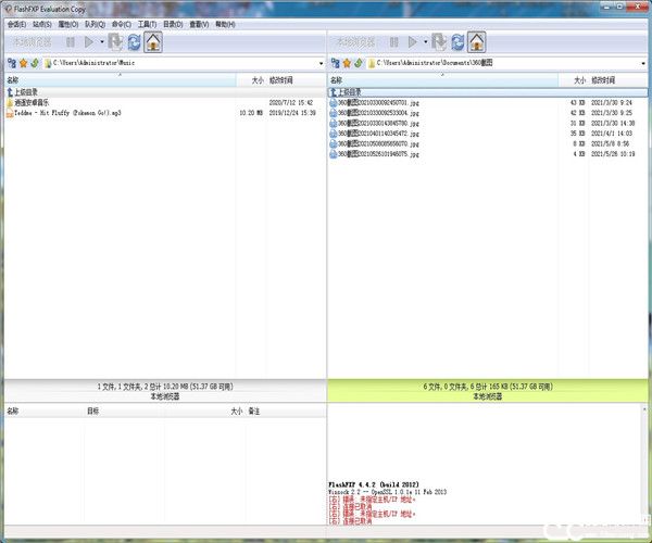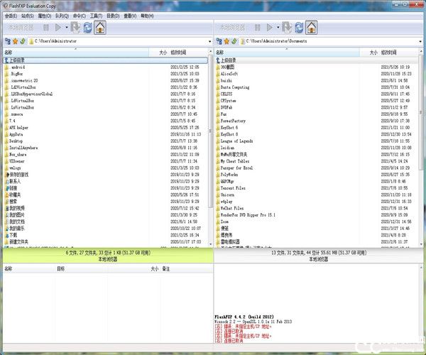 FlashFXP是一款功能齐全且强大的FTP/FXP软件,取其他FTP软件的优势化为自己的长处,如像 CuteFTP一样可以比较文件夹,支持彩色文字的显示;像BpFTP一样,支持多个文件夹同时选择文件,能够缓存较多的文件夹;像LeapFTP一样的简洁功能,一目了然的外观界面,甚至设计思路也有异曲同工之处。打开FlashFXP软件,有四大模块,左上角是本地浏览器的文件夹,以便选取文件,当选中需要的文件时,只需拖动即可传到FTP内,可以说是非常的简单;而右上角这是我们远程浏览器,站点目录,我们可以通过新建站点,把我们需要的文件从本地文件夹中拖到站点目录中即可;在左下角则是我们的传输目录以及传输的时间和速度;最后在右下角是显示文件是否传输成功或者失败,以及数量,如果传输失败会提示,也会显示文件夹的信息,以便用户能更好的了解。就这简简单单的四个模块,集合了FTP的全部功能,以及非常便捷的使用。不同的文件夹会显示不同的颜色,当然也可以缓存远程文件夹列表;具有防止被站点强制退出的功能,也可以显示或隐藏属性文件、文件夹,最后也支持每个站点使用被动模式等等。也提供了最简便和最快速的途径来通过FTP传输任何文件、文件夹,提供了一个格外稳定和极其强大的程序,确保工作能够迅速且高效地顺利完成。有多种语言可以选择,当然也有中文,非常适合我们。功能的强大需要用户自己去挖掘,去发现。