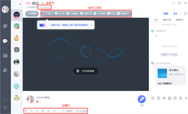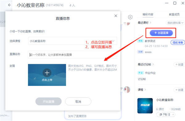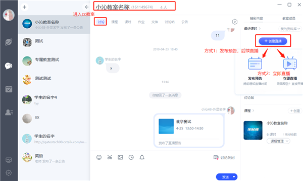 【CC教室直播状态】 班主任/老师/班委均可点击群内右侧“创建直播”进入直播教学