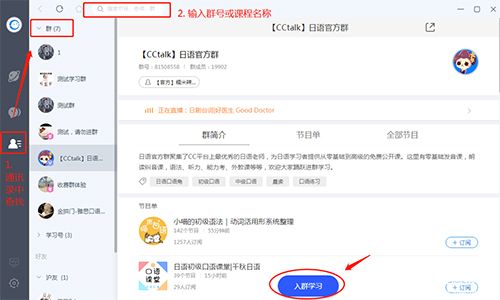 (一)登录,点击左侧的通讯录-群-找到所购买的课程,或者在搜索框中输入群号、群名称查找,点击入群学习即可