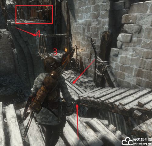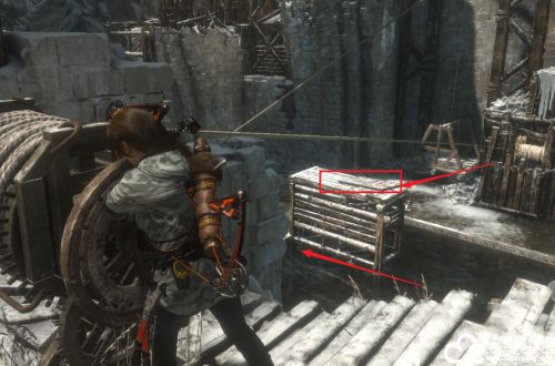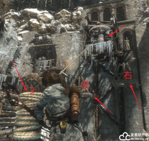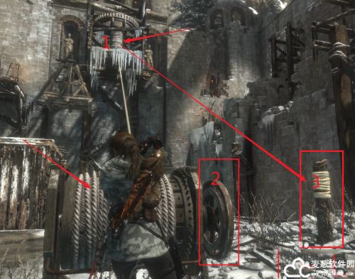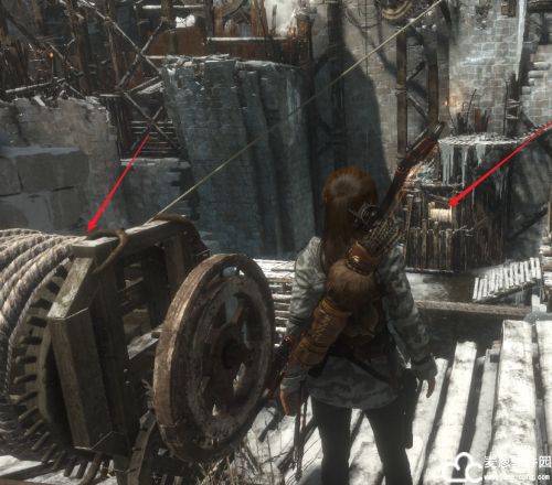 继续深入城市,经过几场遭遇战后来到第二台投石器前,然而道路被冰墙封住了。用弓箭射击木桩上的绳结转动机关,使重物面向冰壁,然后跳上重物即可击碎冰墙