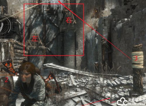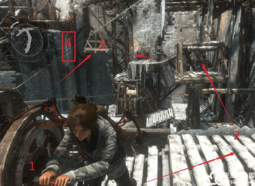 10、在古墓丽影崛起免费完整版,攀爬上到标记1的平台后,跳到前面的线索上,并向右攀爬回第二层右边的平台